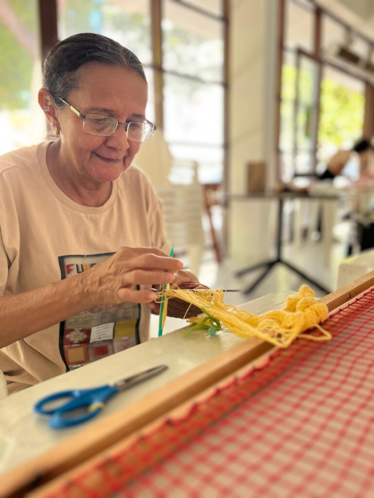 Conviver com mulheres que estavam passando por situações parecidas com a minha através da socialização que o programa proporciona, nos coloca em um estado de progresso pessoal, onde uma pode ajudar a outra e o novo ofício nos leva a uma nova realidade financeira e emocional”, destacou Fátima, que iniciou o curso em 2023 e hoje é uma das professoras da oficina.