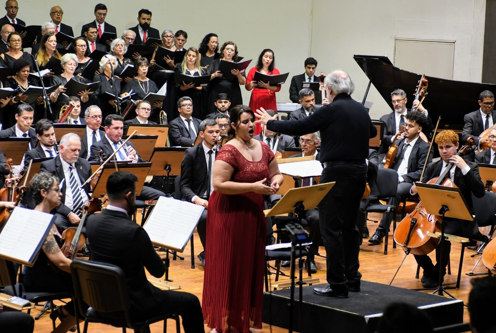 Em seguida, a orquestra recebeu o Coro Sinfônico da Paraíba, sob a regência do maestro Daniel Berg, para tocar “Cactus Dourados”, de N. Tavares (arranjo de Ivo Sousa), com a participação das solistas Alline Fernandes, Karla Rafaella, Williane e Virginia Campos.